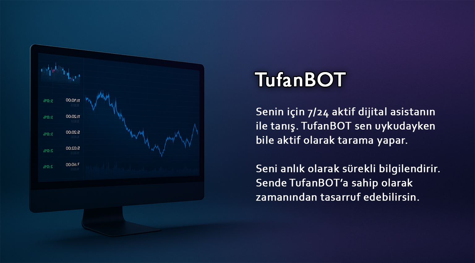TufanBot, senin için tüm ürünleri eş zamanlı tarama yapar. Yapay zeka desteği sayesinde doğru anlarda sana bildirim gönderir. Piyasayı senin yerine 7/24 takip eden bir programdır.